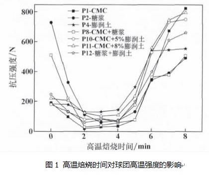 (3) 不同粘結(jié)劑的球團(tuán)干球抗壓強(qiáng)度相差較大,但在高溫焙燒時(shí)強(qiáng)度變化趨勢(shì)基本一致,在焙燒初期 0~2 min 時(shí)球團(tuán)抗壓強(qiáng)度快速降低, 4 ~8 min 時(shí)球團(tuán)強(qiáng)度逐漸提高。
