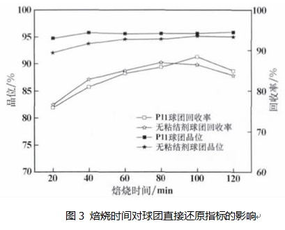 確定球團(tuán) P11 為配方后,對(duì)其進(jìn)行直接還原焙燒-磁選試驗(yàn)。無粘結(jié)劑球團(tuán)作為對(duì)照試驗(yàn),考察粘結(jié)劑對(duì)球團(tuán)直接還原焙燒磁選的影響。從圖3 可以看出,兩種球團(tuán)隨焙燒時(shí)間的變化趨勢(shì)基本一致,隨著焙燒時(shí)間的延長,直接還原鐵產(chǎn)品品位變化不大;回收率呈先升高后緩慢降低的趨勢(shì)。