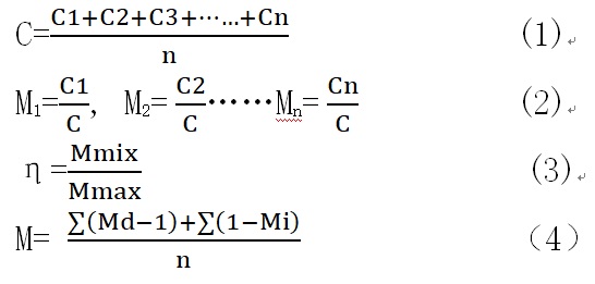 衡量混合作業(yè)的質(zhì)量可用混合效率η和混合料的平均均勻系數(shù)m來計算,其計算公式如下: