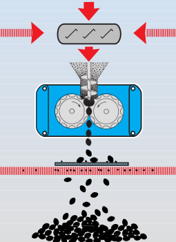 設(shè)備的電機驅(qū)動螺旋送料裝置將物料從進料口置入, 隨后粉粒體物料被送至相向轉(zhuǎn)動的兩壓輥之間,兩壓輥中其中一個為活動輥另外一個為固定輥,通過液壓系統(tǒng)提供壓力,被送入物料在壓輥之間被壓縮成型。壓輥表面有定制的模具,模具的幾何尺寸可以定制,被送入物料可能是單一物料或是混合物料,也可能需要添加一定的結(jié)合劑,來提高物料的成球性。