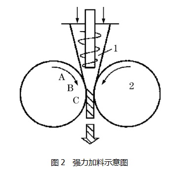 采用強力加料對組份多、比重相差大的錳粉礦壓制球團比較合適。強力加料除有加料作用外, 還對物料有預壓作用, 破壞物料的“達橋效應(yīng)”, 排除物料中的部分氣體, 如圖所示, 物料在A 處填滿球窩, 在 B、C 處由于螺旋的作用物料只能強迫地留在球窩內(nèi),隨著對輥轉(zhuǎn)動脫出球窩, 在之前始終是充滿的。