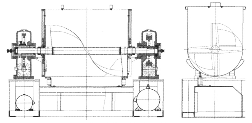 機械攪拌式混合機的儲料槽固定不動,利用安裝在槽內(nèi)的攪拌器的旋轉(zhuǎn)達(dá)到混合物料的目的,能處理附著性、凝集性強的粉體、濕潤粉體和膏狀物料,對于物性差別大的物系的混合也很適用。此類混合機裝填率高、操作面積小、占用空間小、操作方便。由于可設(shè)計成密閉式和安設(shè)夾套,所以可在非常溫常壓下工作,也可以用于反應(yīng)、制粒、干燥、涂層等復(fù)合操作中。缺點:機器的維修和清洗困難,故障發(fā)生率高,容器及攪拌機上會部分地固結(jié)粉體。其結(jié)構(gòu)如圖所示: