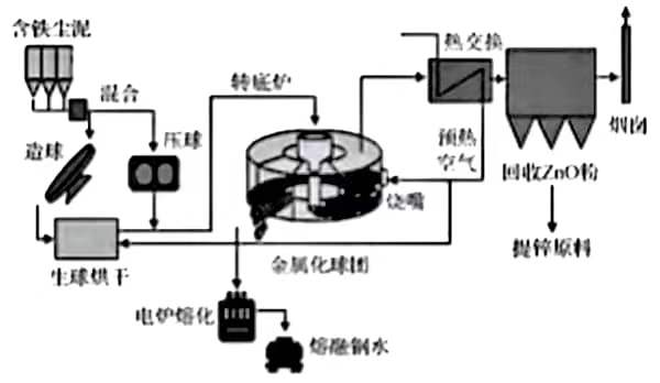 壓球的方式將各種除塵灰、污泥制成球團(tuán),經(jīng)過烘干、預(yù)熱、焙燒還原、冷卻等工序生產(chǎn)、金屬化球團(tuán),用于電爐作為造渣劑或替代廢鋼使用;塵泥中的鋅在高溫下被還原成單質(zhì)鋅,揮發(fā)進(jìn)入煙氣,煙氣經(jīng)冷卻、除塵后得到副產(chǎn)品氧化鋅粉,用于進(jìn)一步提鋅,處理效果顯著。